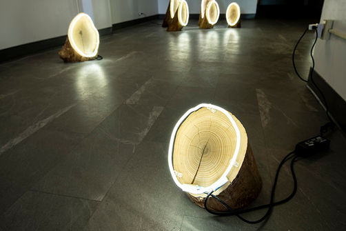 The shapes of the objects draw inspiration from the architecture and forms of the trees themselves. Departing from some of his previous work, Lemley employs a softer free-form geometry to visualize systems of layering, accumulation, connection, and transference. In certain areas, he intentionally leaves visible the distinctive trails of the borer. The addition of hand-bent white neon tubes accentuates the shapes and surfaces of the wood, creating an ethereal atmosphere. The play of light, existing as both particle and wave, becomes both an extension of the object and an experiential phenomenon for the viewer and their senses. The neon and wooden objects come together to form a forest installation that serves as a monument to loss.