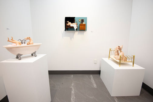 In ✨just girlie things✨, Eva Polzer explores the complicated patriarchal “nurturing” of femininity and how it encourages girls and women to simultaneously hate and sexualize their bodies. Polzer creates sculptures inspired by the Borzoi dog and the Sphynx cat to discuss the normalization of blind devotion, unwanted attention, and the desire to retain some kind of power through avoidance.